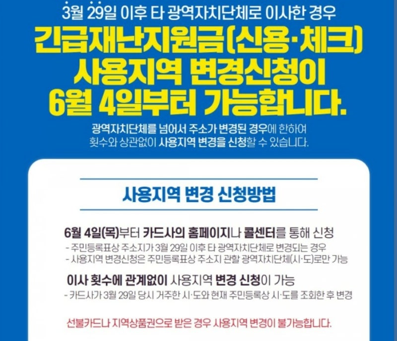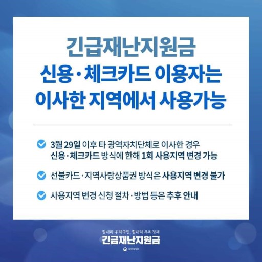 긴급재난지원금사용처변경 긴급재난지원금사용지역변경 재난지원금사용지역 재난지원금사용지역변경. 따라서 이 기간 내에 사용 중인 신용 체크카드 사의 홈페이지 접속 또는 콜센터 문의를 통해 변경하시길 바랍니다. 사용 가능 주소지 기준일인 29일 이후 이사한 국민들의 편의를 위해서다.