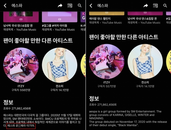 그룹 에스파 소개글에 운x해라 이기야 유튜브 뮤직 일베 논란 머니투데이